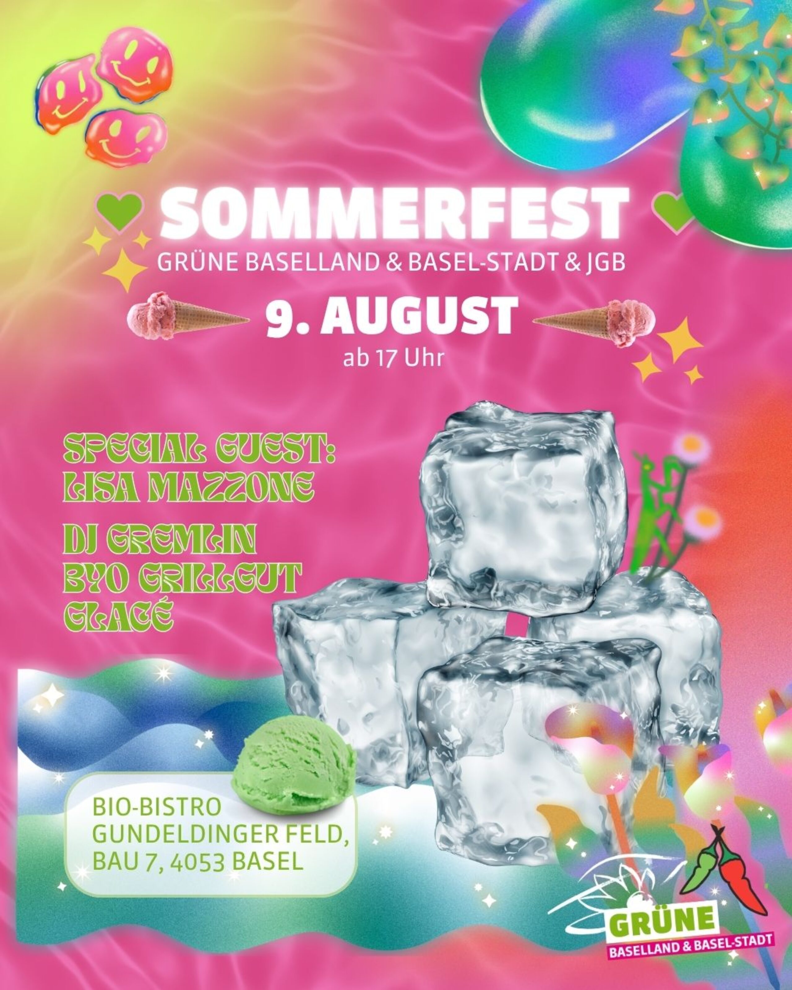 Packt eure Wasserpistolen ein, bringt eure Liebsten mit und lasst uns gemeinsam Glacé schlecken, diskutieren, tanzen – und vor allem gemeinsam eine gute Zeit haben. 💚